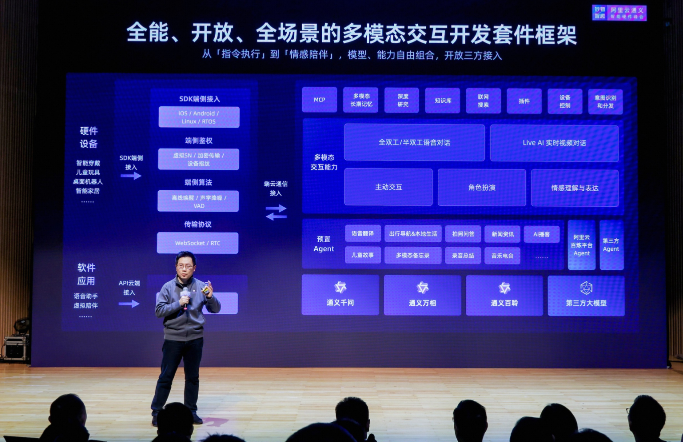 1月8日消息(报道:李楠)今日,在阿里云通义智能硬件展上,阿里云发布多模态交互开发套件,该套件集成了千问、万相、百聆三款通义基础大模型,并预置十多款生活休闲、工作效率等领域的Agent和MCP工具,不仅能听、会看,还能思考并且与物理世界交互,可应用于AI眼镜、学习机、陪伴玩具、智能机器人等硬件设备。 随着多模态大...